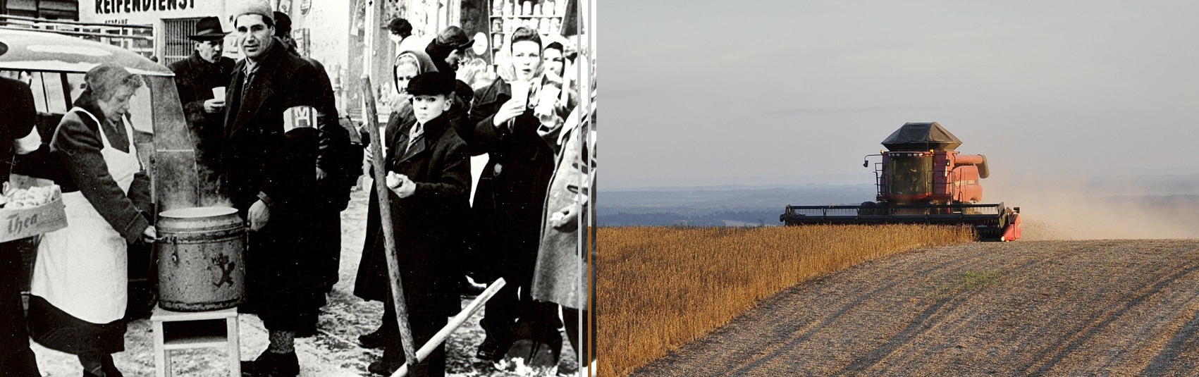 Fotocredits: Volkshilfe Suppenküche auf der Straße, 1940er Jahre, Wikimedia Commons CC-BY-SA-4.0 VolkshilfeÖsterreich; Soya Harvest, Pixabay CC-0 Charles Ricardo