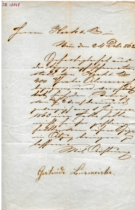 Bild: Brief von Gertrude Burmeister an die Druckerei Keck & Co. Original-Handschrift (URN: urn:nbn:at:AT-WBR-326870; ID-Nr.: AC15903486), Wienbibliothek im Rathaus. Digitalisat des Briefes: <https://www.digital.wienbibliothek.at/wbrobv02/content/titleinfo/3399923> [gemeinfrei] [5.5.2023]